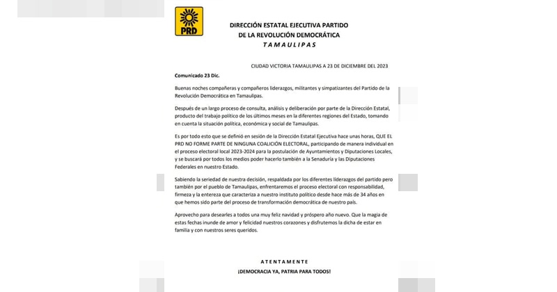 Mediante un comunicado, el presidente del PRD en Tamaulipas, David Armando Valenzuela, indicó, que la decisión se tomó la noche del sábado, después de un largo proceso de consulta, análisis y deliberación, por parte de la Dirección Estatal Ejecutiva.