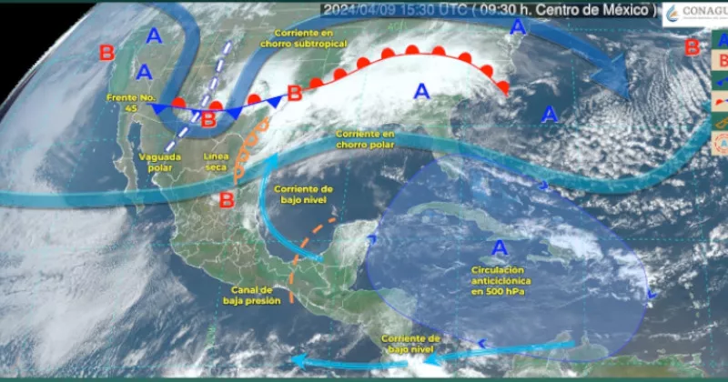 El fenómeno Meteorológico ingresó la madrugada de este martes 9 de abril, y la mayor parte del día las temperaturas serán muy calurosas en gran parte del territorio nacional, con temperaturas máximas de 40 a 45 grados Celsius en Campeche, Chiapas, Colima, Guerrero, Jalisco, Michoacán, Morelos, Nayarit, Nuevo León, Oaxaca, San Luis Potosí, Tabasco, Tamaulipas, Veracruz y Yucatán.