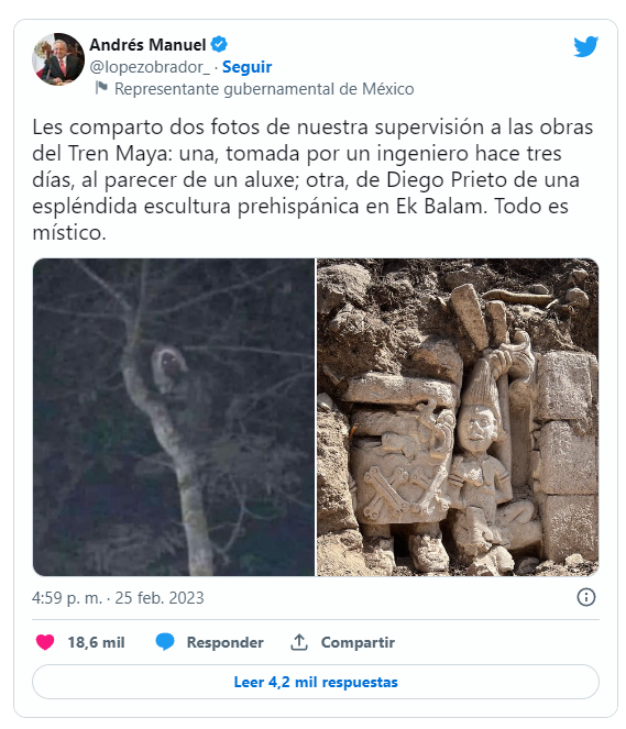 Fue en sus redes sociales oficiales en las que el presidente compartió dos imágenes tomadas durante una supervisión a un tramo del Tren Maya. Sobre la de la figura extraña dijo que fue tomada hace tres días por un ingeniero y en ella se ve “al parecer un aluxe”. La otra de Diego Prieto “de una espléndida escultura prehispánica en Ek Balam”. “Todo es místico”, escribió como remate a su publicación, la cual fue ampliamente compartida.
