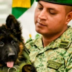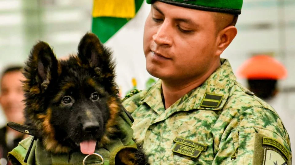 Elementos de la Secretaría de la Defensa Nacional (Sedena), fueron los encargados de darle la bienvenida al cachorro, un pastor alemán de tres meses de edad que será entrenado para realizar labores de búsqueda en siniestros.