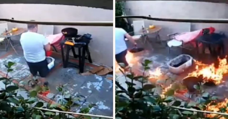 Al intentar sofocar las llamas, el hombre patea el recipiente de plástico que golpea la mesa, ocasionando que caiga el asador y el carbón en llamas incendiando todo lo que había al rededor. Invadido por el pánico, el sujeto sale corriendo de lo que parece ser el patio delantero de su casa que quedó totalmente cubierto por humo en cuestión de segundos