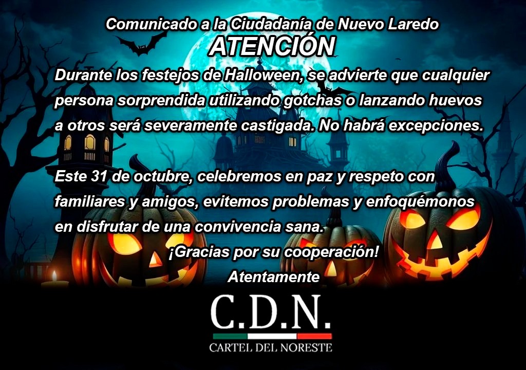 Nuevo Laredo, Tamaulipas.- En la última hora a comenzado a circular por redes sociales y grupos de WhatsApp una imagen en donde el Cartel del Noreste (CDN) hace un llamado para evitar que la gente lance huevos, dispare gotchas o cause algún disturbio ya que de ser sorprendido haciendo estos actos serán castigados sin excepción alguna.