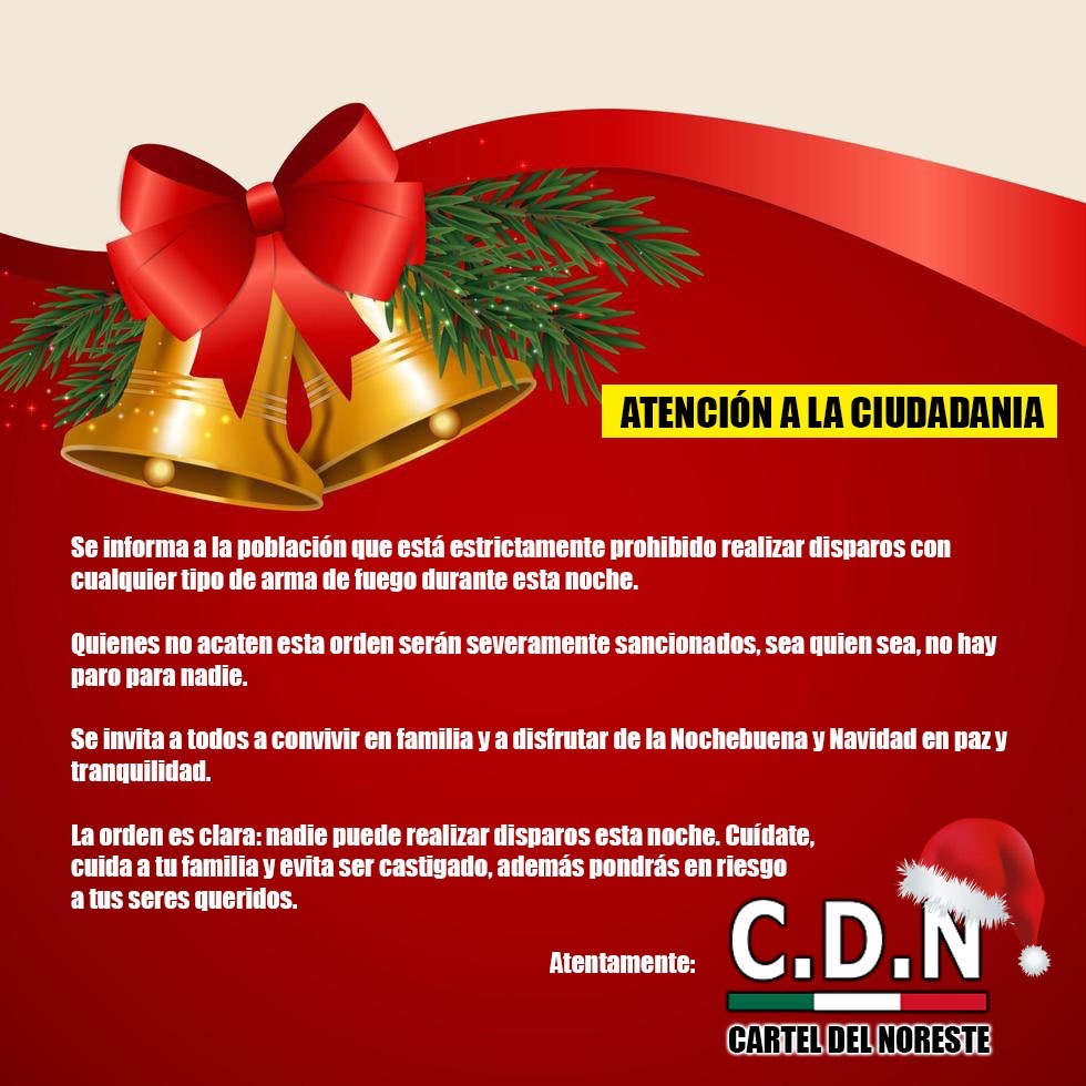 A través de una imagen que circula en diferentes grupos de WhatsApp de la localidad, el Cartel del Noreste (CDN) informa a la ciudadanía que está prohibido realizar disparos con cualquier tipo de arma.