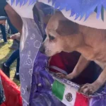 Resguardado del sol en su pequeña casa morada, Chibolín, un adorable perro Chihuahua pudo disfrutar del desfile y ver pasar a sus héroes de cuatro patas.