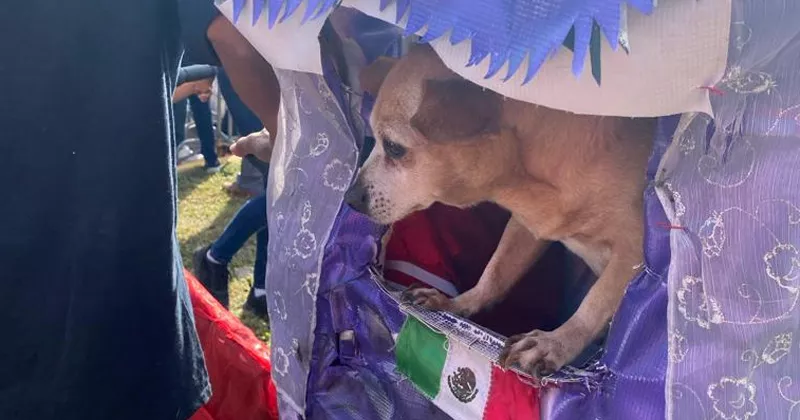 Resguardado del sol en su pequeña casa morada, Chibolín, un adorable perro Chihuahua pudo disfrutar del desfile y ver pasar a sus héroes de cuatro patas.