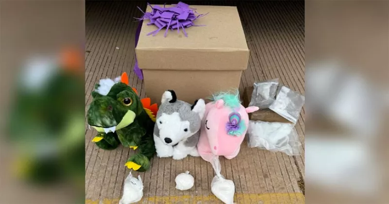 Imágenes compartidas por este cuerpo de seguridad muestran las tres figuras de peluche, una de ellas con la forma de un dinosaurio, otra de un lobo y una más de un unicornio, en las cuales estaba oculta la droga.
