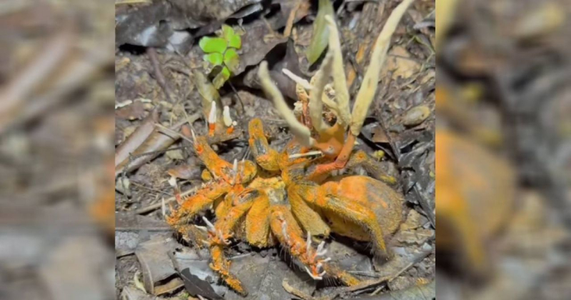 El investigador encontró a una tarántula muerta con las características de haber sido invadida por la espora del hongo, dijo en sus redes sociales donde compartió un video sobre el descubrimiento donde recalcó la acción que hizo el hongo sobre su huésped: