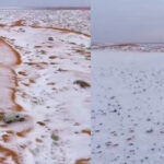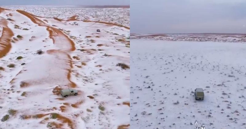 El desierto ubicado en la provincia de Hail en Arabia Saudita se tiñó de color blanco ante la caída de una fuerte tormenta que trajo consigo una fuerte presencia de granizo, cuya gran cantidad ocasionó que la arena de la zona quedara completamente debajo de los pequeños hielos.