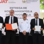 CIUDAD VICTORIA, TAMAULIPAS.- El rector de la Universidad Autónoma de Tamaulipas (UAT), MVZ Dámaso Leonardo Anaya Alvarado, entregó nombramientos a nuevos directivos de la Unidad Académica Multidisciplinaria Mante Centro (UAMMC), quienes, dijo, llevarán a niveles de excelencia el desempeño de este plantel de la máxima casa de estudios del estado.