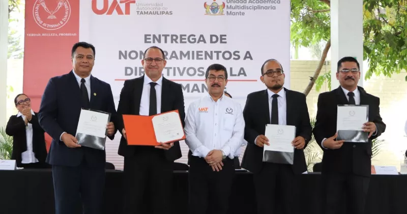 CIUDAD VICTORIA, TAMAULIPAS.- El rector de la Universidad Autónoma de Tamaulipas (UAT), MVZ Dámaso Leonardo Anaya Alvarado, entregó nombramientos a nuevos directivos de la Unidad Académica Multidisciplinaria Mante Centro (UAMMC), quienes, dijo, llevarán a niveles de excelencia el desempeño de este plantel de la máxima casa de estudios del estado.