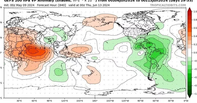 “Condiciones atmosféricas en el Caribe podrían tornarse favorables para desarrollo ciclónico durante la primera mitad de junio 2024 según las proyecciones de la propagación del MJO (Oscilación Madden-Julian)”.