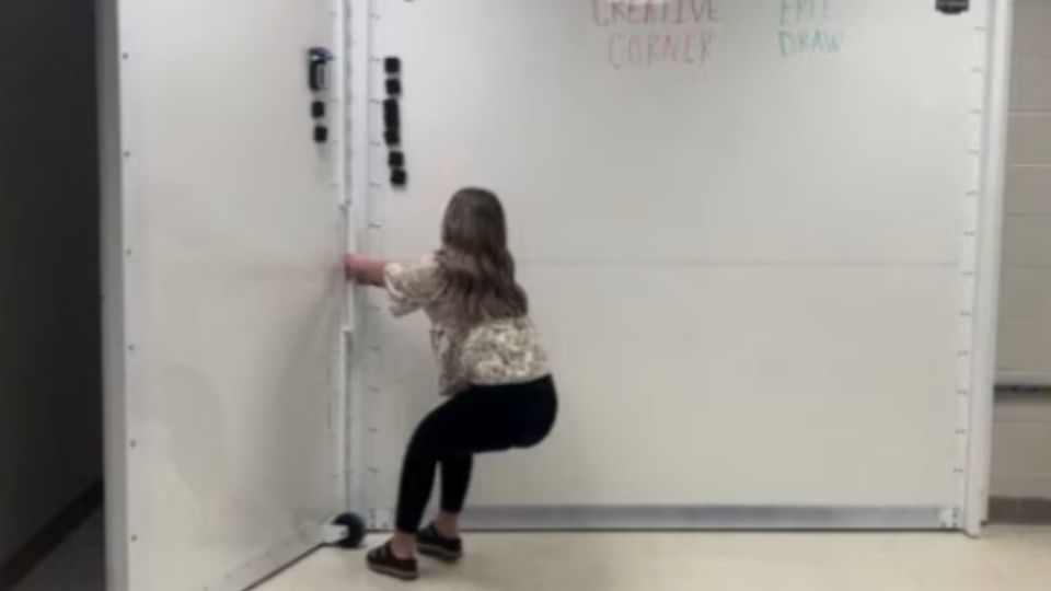 La pared blindada en la Escuela Primaria West, cumple la función doble de un pizarrón blanco que se puede desplegar en segundos para convertirse en una especie de barrera protectora.