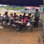 Los estudiantes de la escuelita, que han demostrado una resiliencia admirable, estudian en un entorno que carece de lo básico para su protección, estudian bajo una lona que no les cubre lo suficiente del inclemente sol y la lluvia, y tienen que jugar en su recreo entre el lodo y tierra.
