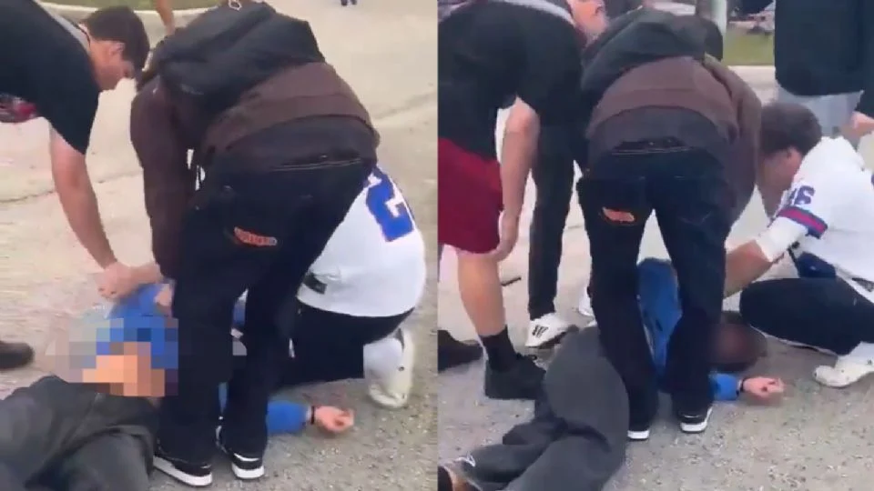 De acuerdo con medios estadounidenses, la riña se registró el pasado martes 12 de diciembre. En la grabación se observa a un grupo de jóvenes golpeando a un estudiante, quien cae al suelo tras ser lanzado al pavimento por uno de los agresores, y queda inconsciente al instante, luego de que su cabeza se golpeara contra el piso.