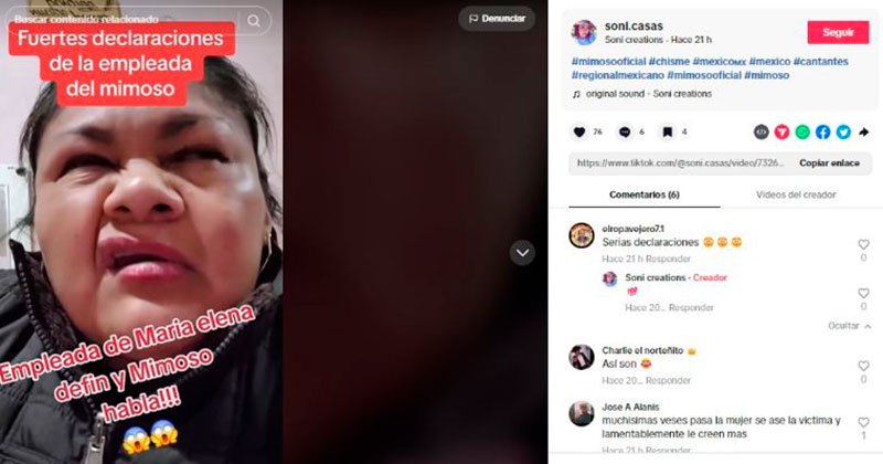 En redes sociales se viralizó un video en donde aparece quien asegura ser una exempleada doméstica de la pareja conformada por El Mimoso y María Elena Delfín en donde comparte que las cosa no son como la presunta víctima menciona y que el cantante no hizo lo que ella contó.