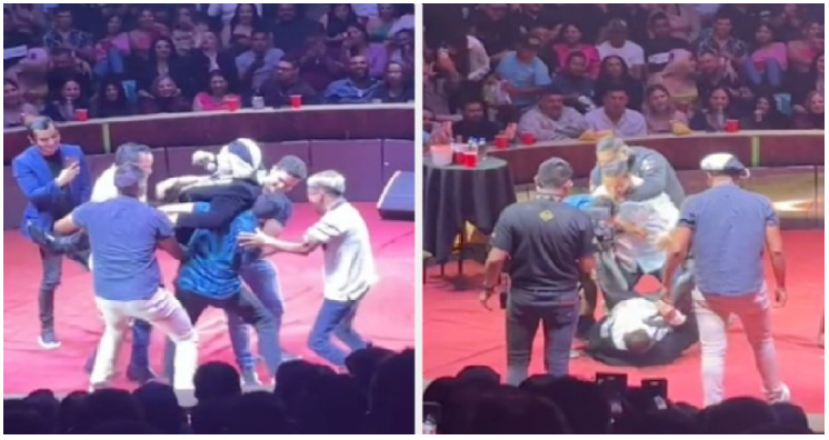 A través de TikTok el usuario “Dorinamaqui” compartió el video donde se muestra el momento exacto en el que el comediante es “tacleado” por uno de los asistentes que fue parte de las dinámicas. En el clip se observa el instante en el que el payaso es cargado por seis sujetos como parte de una broma, aunque uno de ellos lo llevó muy lejos al derribarlo por los pies provocando una dolorosa caída y luego arrastrándolo por el escenario.