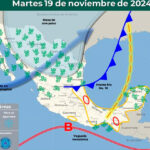 “Durante el martes y miércoles, el frente frío No. 10 recorrerá la vertiente del golfo de México, en interacción con un canal de baja presión en el sur de dicho golfo, generarán chubascos y lluvias fuertes a muy fuertes en el noreste, oriente y sureste del país, además de la Península de Yucatán”.