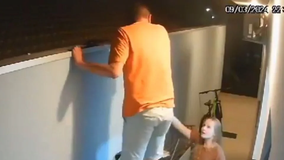 Bruno se encaramó en una barra dentro de su casa para investigar lo que estaba sucediendo, mientras una mujer que se presume ser su esposa le imploraba que bajara de allí.
