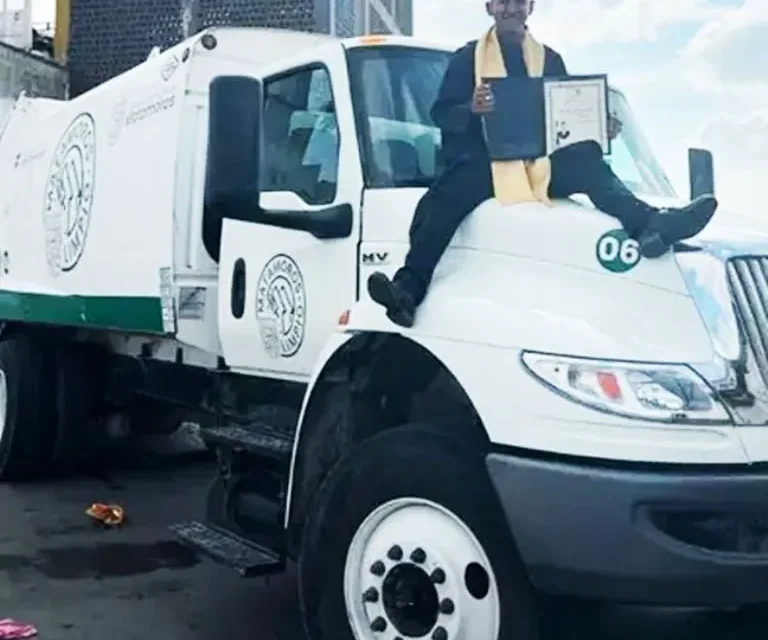Y orgulloso de sus logros, el joven compartió en sus redes sociales varias fotografías en donde viste su toga de graduación y muestra su título de abogado, mientras está a bordo del camión recolector de basura en el que trabajó durante toda su carrera.