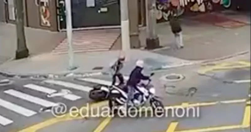 BRASIL.- Un video compartido en redes sociales muestra el incidente en el que dos individuos que se trasladaban en una motocicleta detienen su marcha a la par de otro motociclista e intentar robarle amenazándole con una arma de fuego.