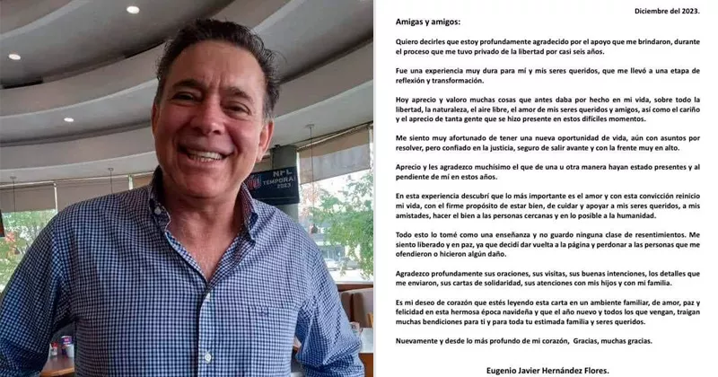 CIUDAD VICTORIA, TAMAULIPAS.- Sin rencores, liberado y en paz, así se siente el ex gobernador Eugenio Hernández Flores, quien a través de una carta publicada en las redes sociales de su hermana Susana publicó para agradecer las muestras de apoyo que ha recibido.