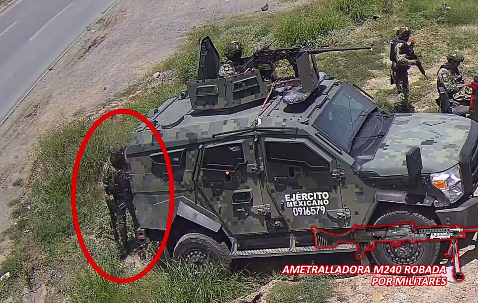 A las 14:40 horas con 20 segundos la ametralladora M240 es sustraída –es evidencia- y subida al SandCat, así como diversos objetos, entre ellos equipo táctico y al menos dos cascos; a las 14:41 horas, el SandCat se retira del lugar, llevando las armas robadas y que ahora son objeto de investigación por la FGJM.
