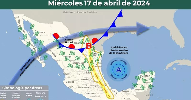 “El día miércoles, el frente No. 46 adquirirá características de estacionario sobre el norte y noreste del país, interaccionará con un canal de baja presión extendido sobre el noreste y oriente del territorio nacional, divergencia en altura y el ingreso de humedad del Golfo de México, ocasionando lluvias puntuales fuertes en dichas regiones”.