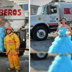 Quinceañera se toma fotos con el camión de bomberos de su mamá