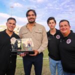 El Alcalde estuvo acompañado por Fabián Ramírez y Juan Carlos Román, directivos del Club de Fútbol Reynosa, para entregarle a Báez un bonito reconocimiento ante los aplausos de la afición.