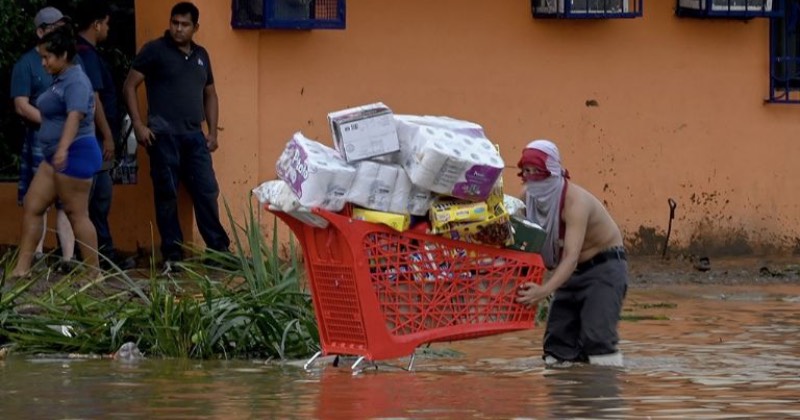 Pese a inundaciones, un hombre se las arregló para llenar un carrito con mercancías, presuntamente sustraídas de un centro comercial.