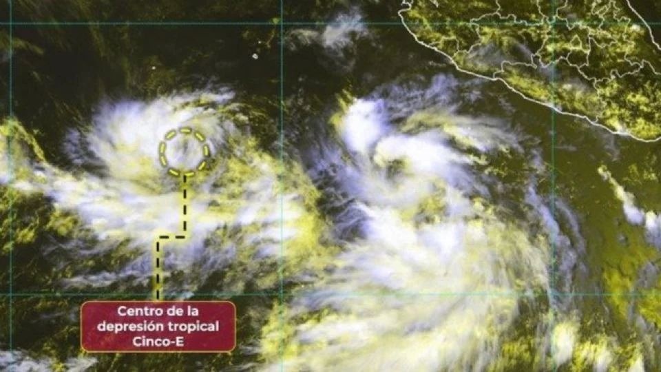 La instancia federal también informó que esta depresión fue denominada depresión tropical Cinco-E, la cual se localiza a 885 kilómetros al sur-suroeste de Cabo San Lucas, en Baja California Sur, y a 970 kilómetros al oeste-suroeste de Cabo Corrientes, Jalisco.