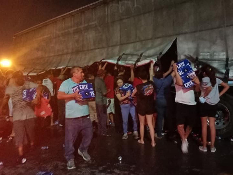 Cientos de personas rompieron la lona de la unidad y usando a los niños bajaron del contenedor las cajas de cerveza.
