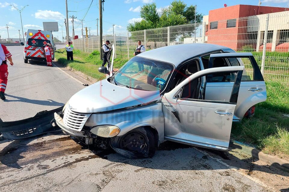 Nuevo Laredo, Tamaulipas.— El chofer de un automóvil salvó la vida pese a que chocó en forma brutal contra un tubo de contención y el cordón de banqueta, a un costado de una empresa transportista localizada sobre la Carretera Aeropuerto, en Nuevo Laredo.