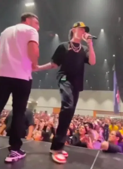 En redes sociales circula un video donde se ve a un joven subirse al escenario con una caja de tenis para ofrecérselos al músico.