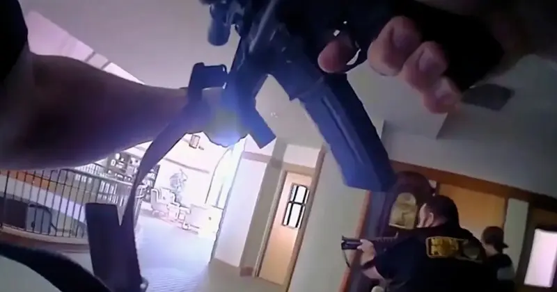 La grabación, de 2 minutos con 20 segundos, muestra al grupo de policías ingresar a la escuela y comenzar la búsqueda de Audrey Hale aula por aula en el primer piso del lugar.