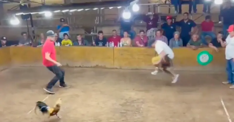 Después de esto, con algo de habilidad, el hombre logra agarrar a su ave e intenta alejarla de la otra, la cual también empezó a atacar. Luego se ve como el sujeto empieza a cojear hasta que le da el gallo a otro sujeto y se tira después en el suelo.